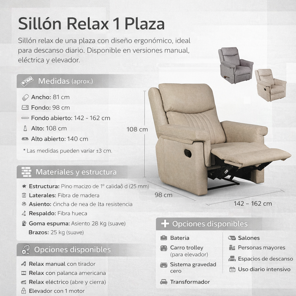 La Butaca MERLIN eléctrica destaca por su equilibrio entre funcionalidad y confort. Además, su estructura resistente y su acolchado ergonómico garantizan una experiencia de descanso superior. En definitiva, es una opción perfecta para quienes buscan comodidad diaria con la posibilidad de incorporar mecanismos eléctricos que faciliten el uso.