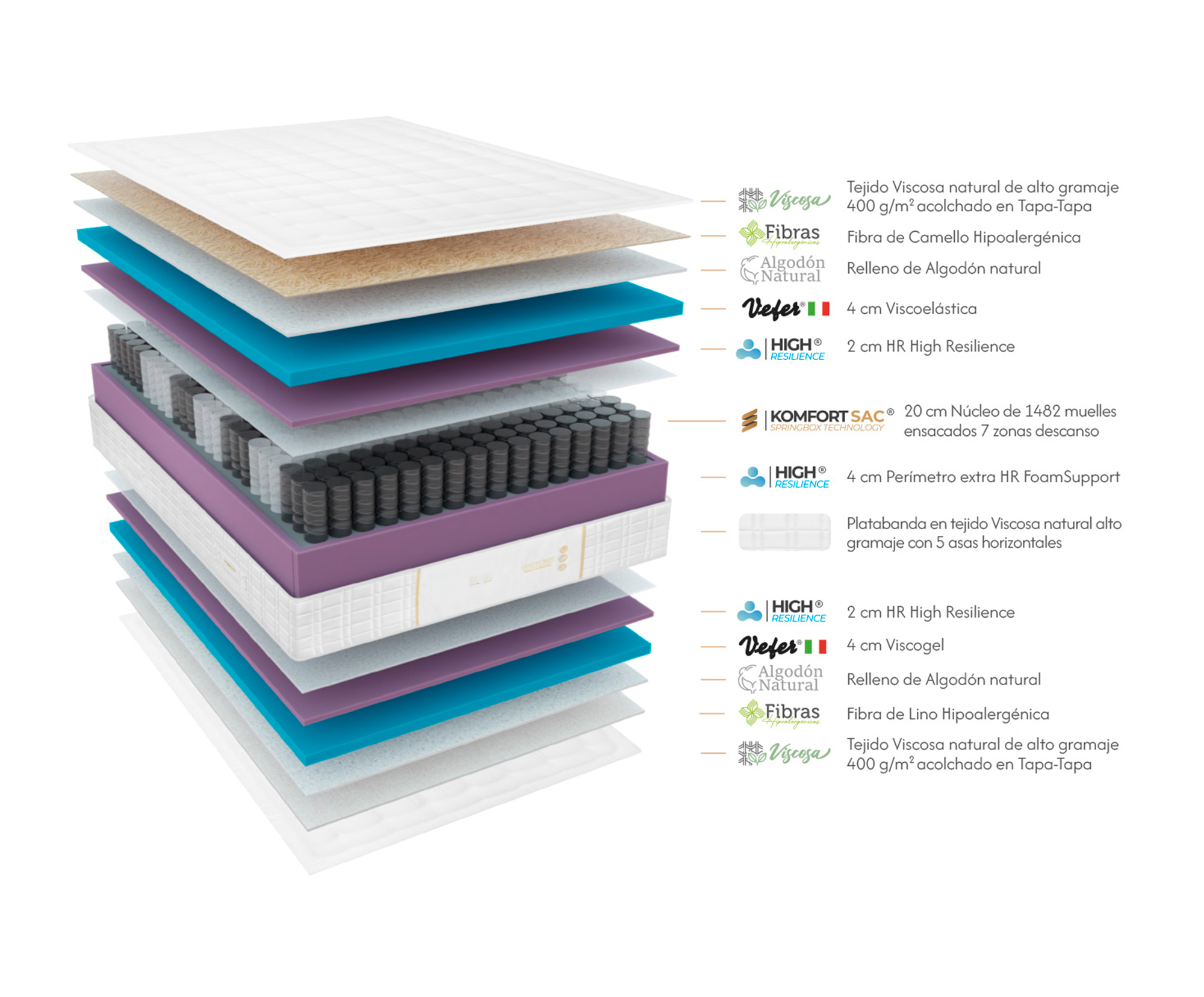 Núcleo de 1482 Muelles Ensacados: Un sistema masivo de muelles independientes (en medida 150×190) que proporciona una adaptabilidad punto por punto y una independencia de lechos absoluta.