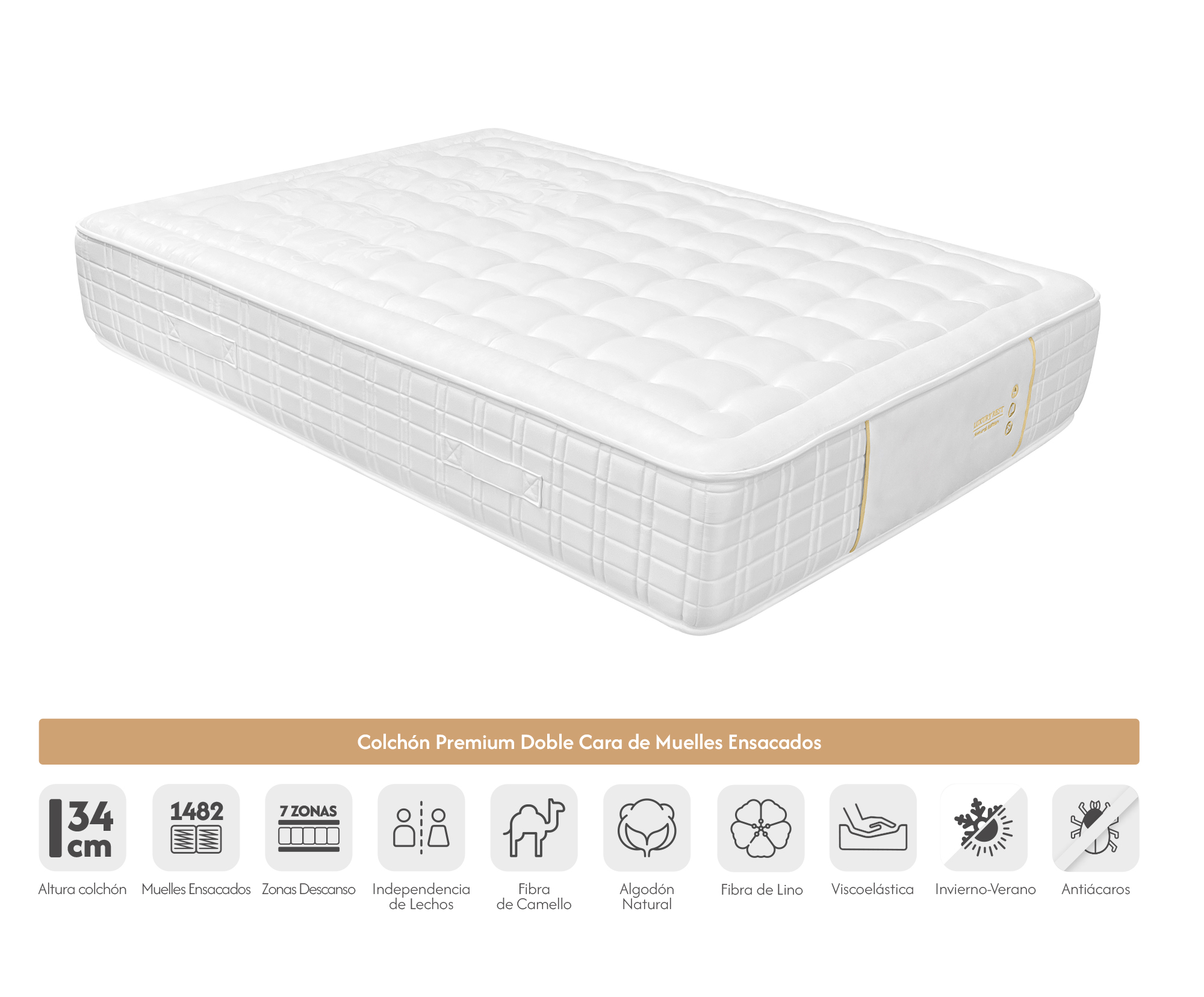 Altura Majestuosa: Posee un porte imponente de 34 cm, situándolo en la categoría de colchones premium de gran formato.