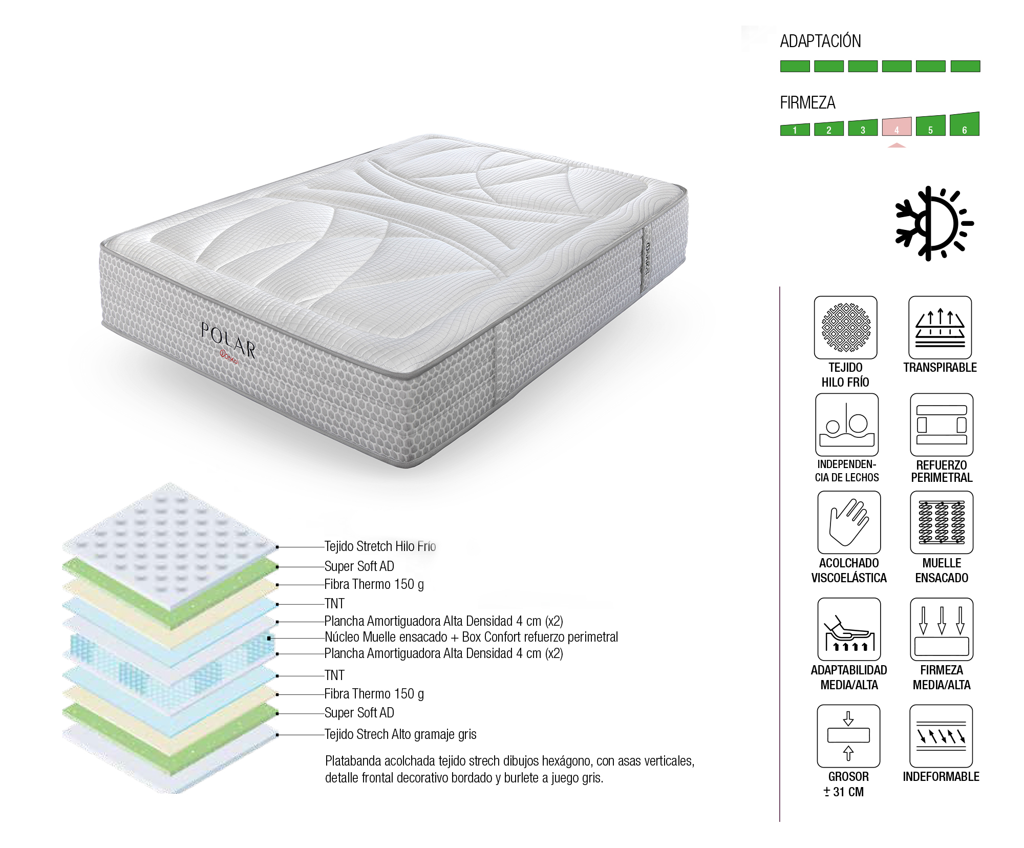 El Colchón POLAR Muelles es un equipo de descanso de alta gama diseñado específicamente como un colchón de invierno y verano. Gracias a su tejido revolucionario de hilos fríos, es la opción ideal para personas calurosas, ofreciendo la sensación térmica más fresca disponible actualmente en el mercado para los meses estivales.