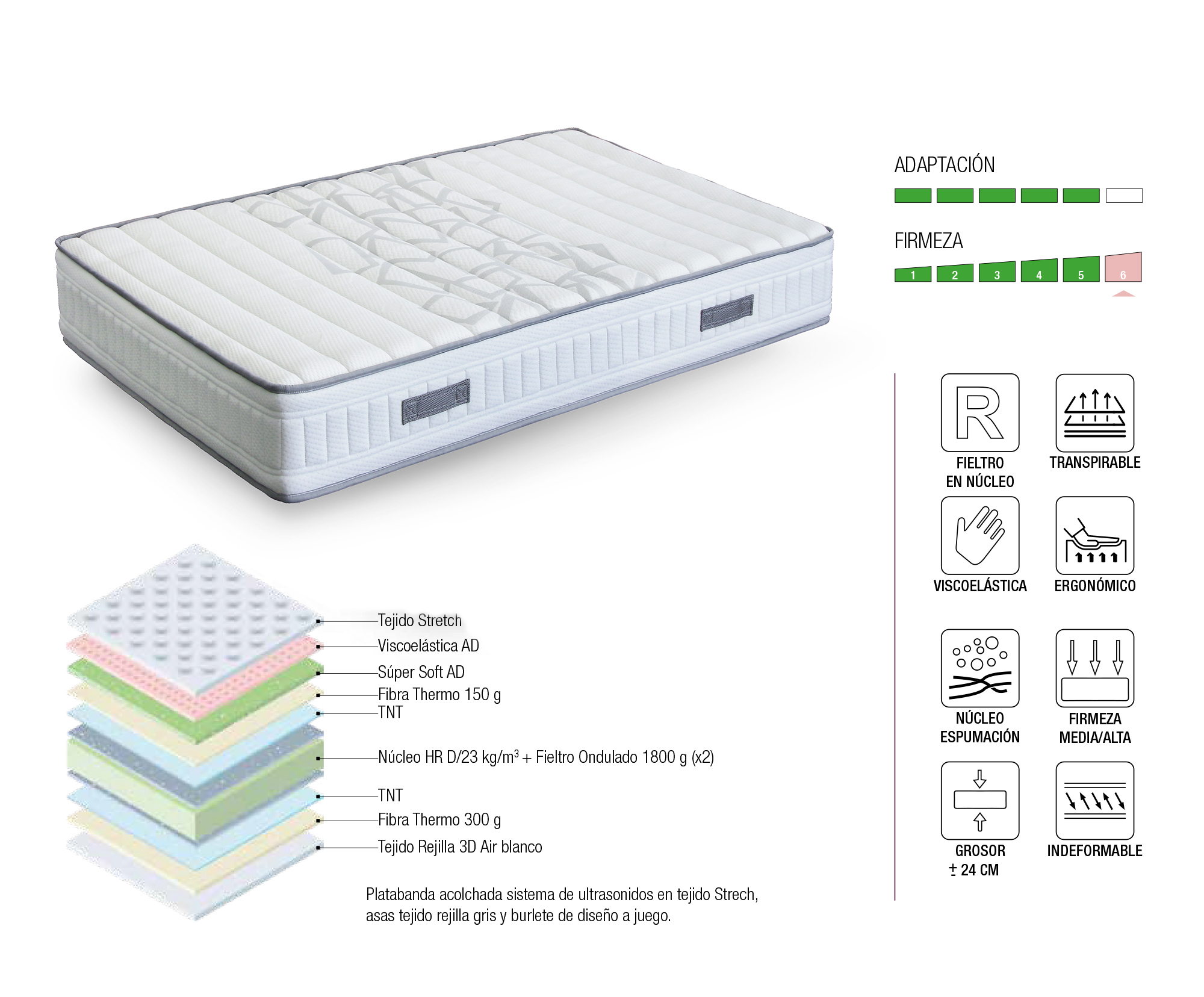 Se trata de un colchón ergonómico, indeformable y altamente transpirable. Además, incluye una platabanda acolchada en tejido Stretch con asas de tejido rejilla gris que facilitan su manipulación y movilidad.