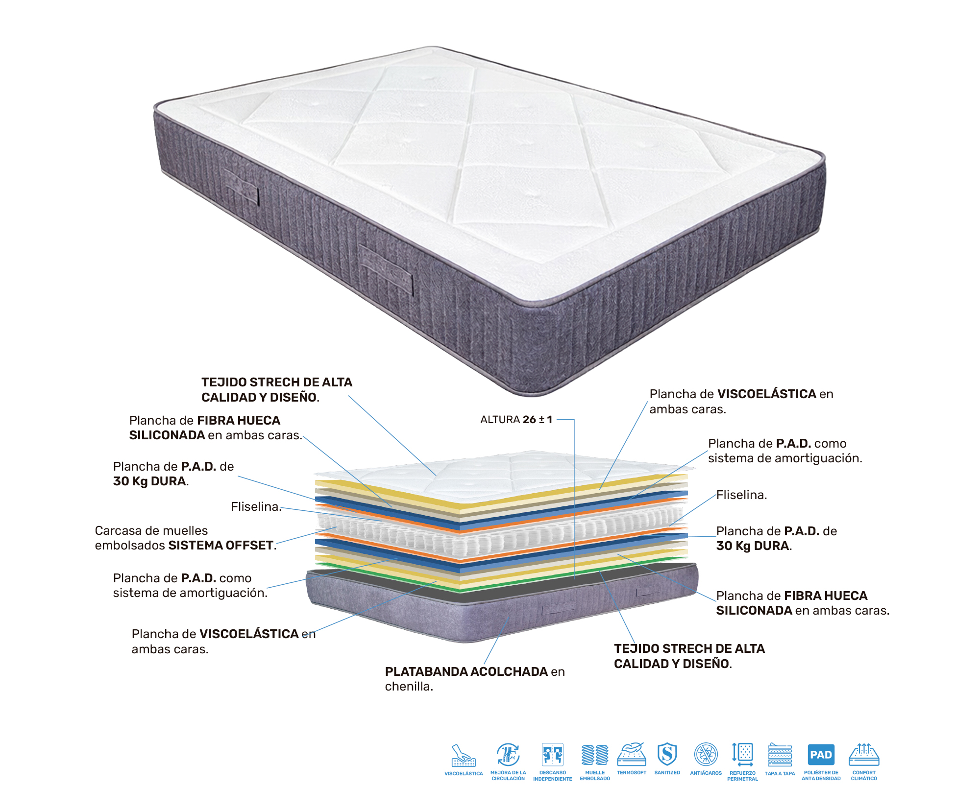 • Altura: Posee un grosor total de 26 cm (±1).