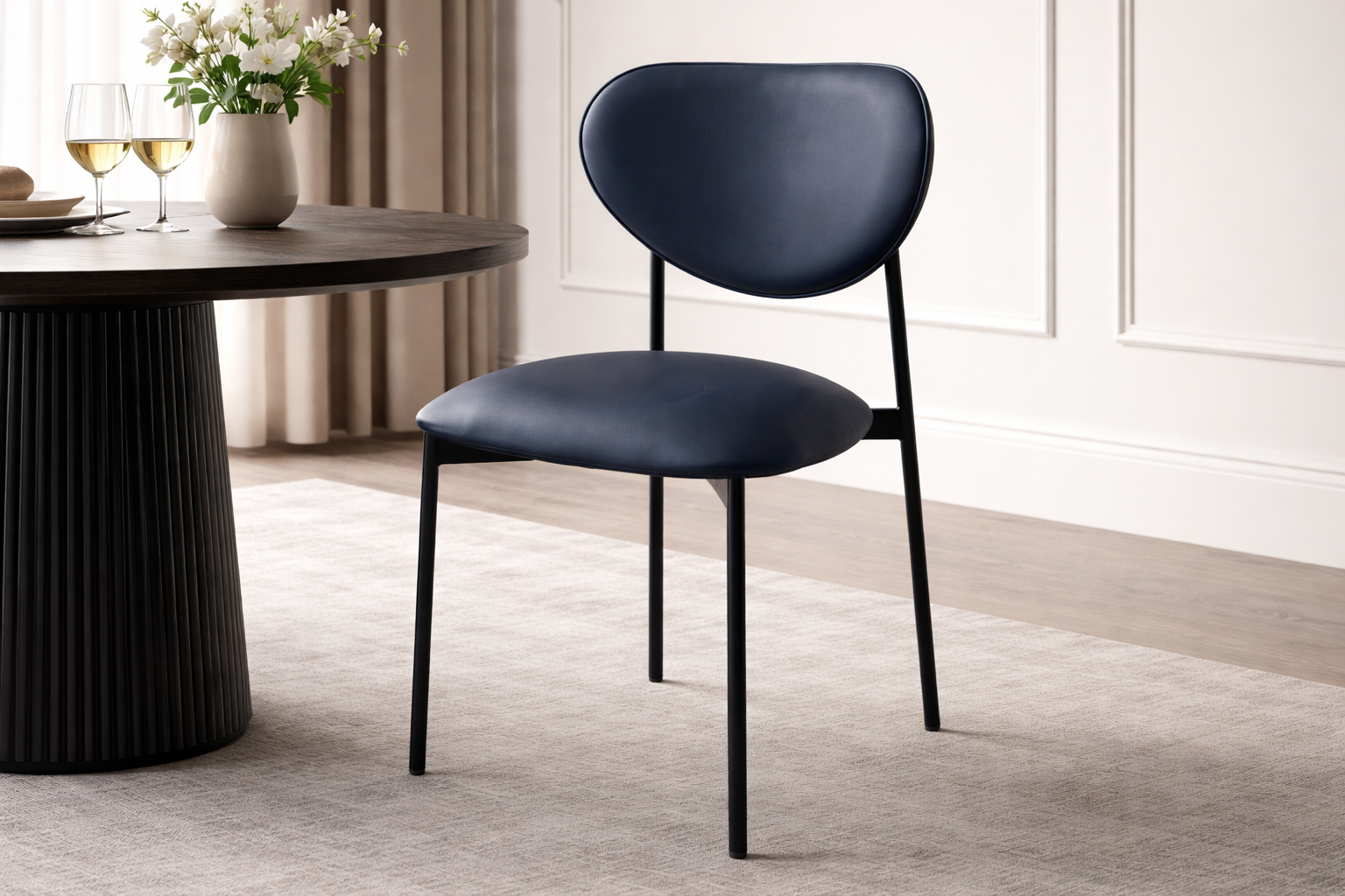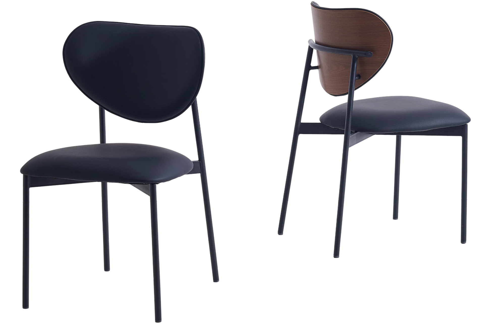La Silla Eva es una declaración de estilo para comedores que buscan un aire cosmopolita y sofisticado. Su diseño fusiona la sobriedad del símil piel negro con la calidez de la madera vista en su trasera, creando un contraste de texturas que eleva la categoría decorativa de cualquier estancia.