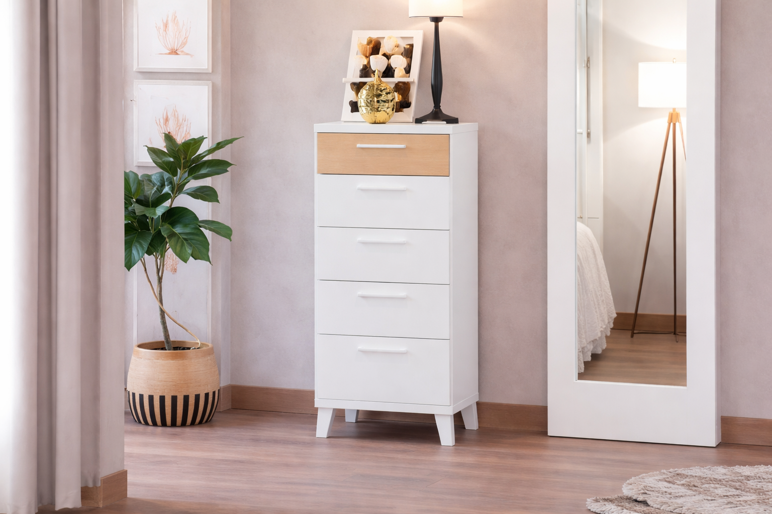 El Sifonier Francia combina el encanto clásico francés con la practicidad moderna. Con unas generosas medidas de 50 cm de ancho, 105 cm de alto y 44 cm de profundidad, este mueble de 5 cajones ofrece amplio espacio de almacenamiento manteniendo un perfil esbelto y elegante.